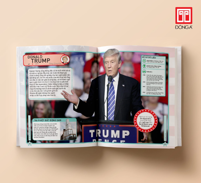 Bách khoa thư hình ảnh: Các đời tổng thống Hoa Kỳ là thước phim đầy màu sắc, sống động về thân thế, sự nghiệp và thành tựu của 45 con người vĩ đại đã kiến tạo và xây dựng nên Hợp chúng quốc Hoa Kỳ hùng mạnh như ngày nay. Ngoài ra, một số Đệ nhất Phu nhân nổi bật, nơi ở, phương tiện đi lại cùng một số điều lý thú ít ai biết của các tổng thống cũng có vinh dự được góp mặt trong cuốn sách này, như một nét chấm phá để người đọc có cơ hội hiểu rõ hơn về những khoảnh khắc rất “đời” của các vị tổng tư lệnh Quân đội Hoa Kỳ.