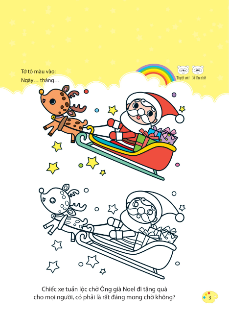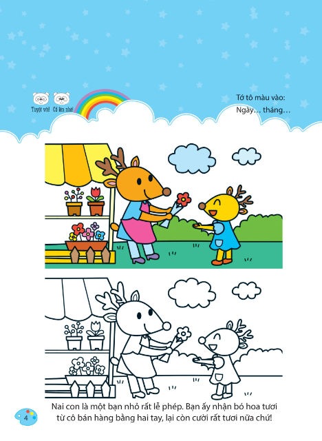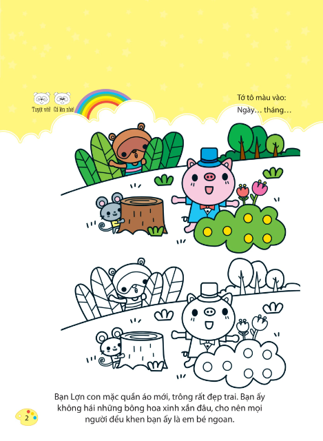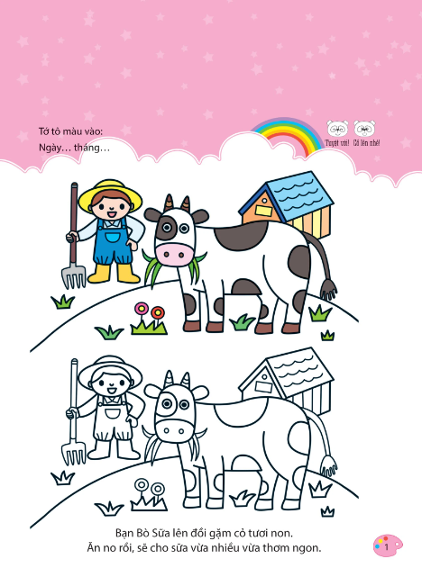 Ngoài việc tô màu theo sự sáng tạo riêng của mỗi bé, sách có gợi ý màu sắc, hình tô mẫu để các bé có thể dễ tưởng tượng và ghi nhớ được hình dạng và màu sắc.