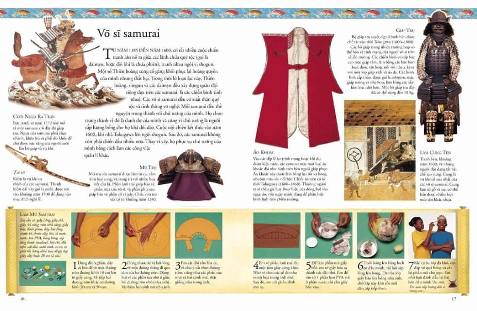 15 trò chơi thủ công thú vị và dễ làm, giúp các em tự tạo ra những món đồ mô phỏng thời xưa- đeo mặt nạ diễn kịch, làm cờ cá chép, trang trí một bức hình phong kiểu Nhật và làm mũ samurai.
