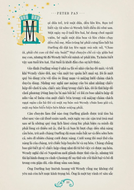 Ra đời cách nay đã hơn một trăm năm, câu chuyện về cậu bé Peter Pan quả cảm, biết bay và không bao giờ chịu lớn đã chinh phục mọi độc giả trẻ thơ và độc giả đã đi qua tuổi thơ. Một câu chuyện lấp lánh phép mầu song lại chẳng phải cổ tích, dành cho trẻ em, cho cả những người lớn biết rằng mình đã lớn, ngoái trông lại tuổi thơ với nụ cười tiếc nhớ, bâng khuâng.