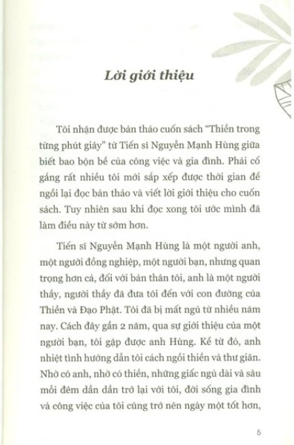 Là một người có rất nhiều năm kinh nghiệm tu tập các tông phái thiền từ nhiều Thiền sư nổi tiếng, là một nhà khoa học, và cũng là người điều hành một doanh nghiệp nổi tiếng trong lĩnh vực lan toả tri thức thế giới đến với gần 100 triệu độc giả Việt Nam (Thái Hà Books), các bài viết của thầy Nguyễn Mạnh Hùng vừa toát ra hương vị thiền từ một lộ trình trải nghiệm thân chứng thực thụ, nhưng lại vô cùng logic khoa học và chính xác những gì thầy muốn dùng ngôn từ để truyền đạt. Cuốn sách “Thiền trong từng phút giây” sẽ vô cùng hữu ích cho những người tu thiền các trình độ khác nhau tra cứu các giai đoạn chứng ngộ của mình trong quá trình tu tập. Đây thực sự là một cuốn sách vô cùng quý báu cho chính tôi cũng như các đồng đạo làm cẩm nang gối đầu giường để dẫn chúng ta đi theo Thầy trên con đường Chánh niệm và tiến tới Đạo quả giải thoát cuối cùng như Đức Phật đã trải qua từ 2600 năm trước.