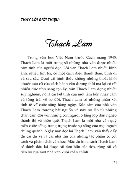 "... Lời văn Thạch Lam nhiều hình ảnh, nhiều tìm tòi, có một cách điệu thanh thản, bình dị và sâu sắc. Dưới cái hình thức không những thoát khỏi khuôn sáo cũ của cách hành văn đương thời mà lại có rất nhiều đức tính sáng tạo ấy, văn Thạch Lam đọng nhiều suy nghiệm, nó là cái kết tinh của một tâm hồn nhạy cảm và từng trải về sự đời. Thạch Lam có những nhận xét tinh tế về cuộc sống hàng ngày. Xúc cảm của nhà văn Thạch Lam thường bắt nguồn và nảy nở lên từ những chân cảm đối với những con người ở tầng lớp dân nghèo thành thị và thôn quê. Thạch Lam là một nhà văn quý mến cuộc sống, trân trọng sự sống của những người xung quanh. Ngày nay đọc lại Thạch Lam, vẫn thấy đầy đủ cái dư vị và nhã thú của những tác phẩm có cốt cách và phẩm chất NXB Văn Học..."